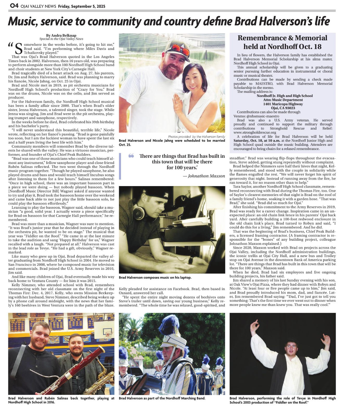 If you live locally, you’d know Brad by the diverse talents he shared with the community: as a multi-instrumentalist who contributed to Nordhoff High School’s annual musical, or as builder who has erected literal infrastructure across our valley.