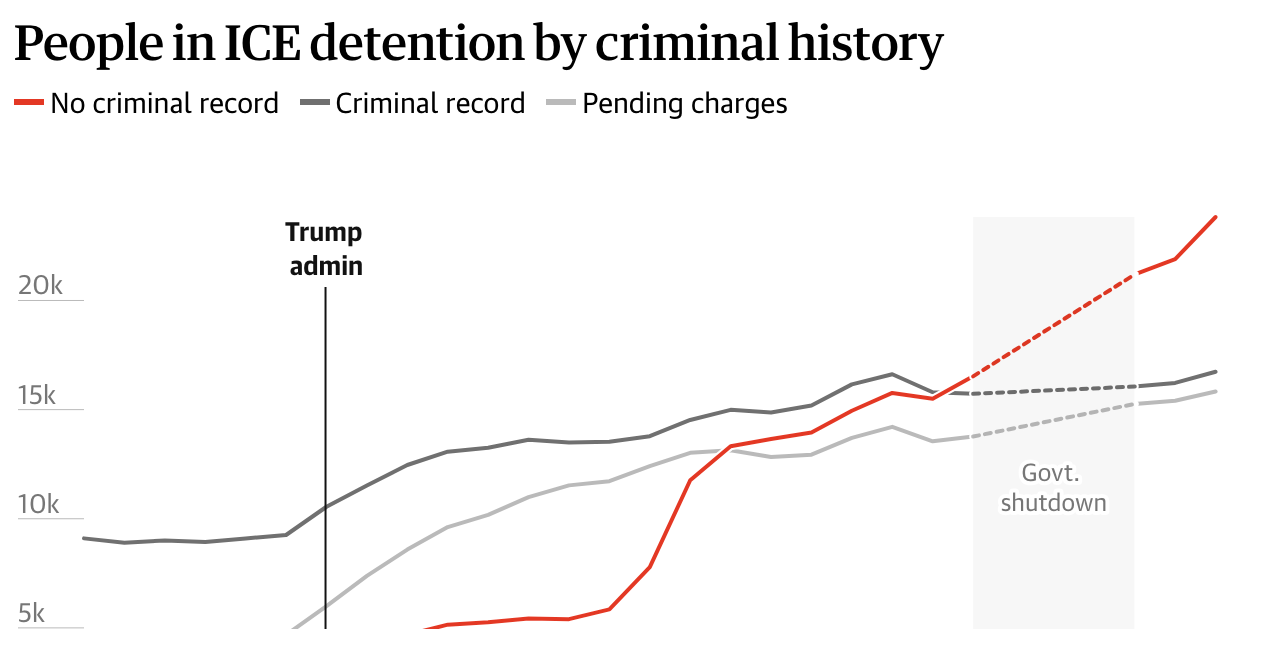 Another recent analysis of ICE data by The Guardian shows that the number of people in U.S. immigration detention reached an all-time-high on Dec. 14th. They also found that immigrants with no criminal record make up the largest group in immigration detention.