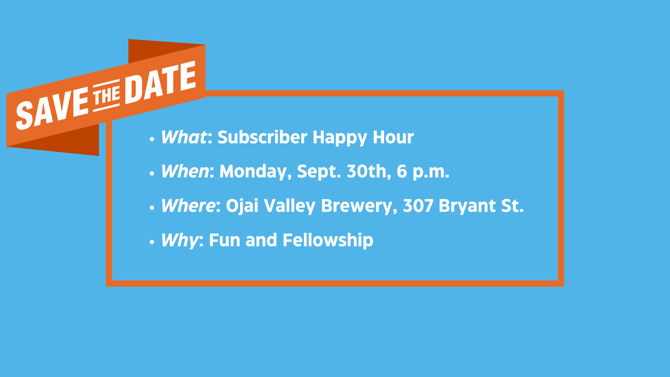 Please join me on Monday, September 30th at 6 p.m. at one of my favorite local businesses: the Ojai Valley Brewery!