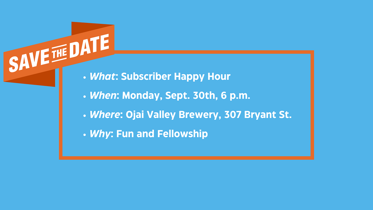 That brings me to my next bit of news: it’s my one-year anniversary! I launched this publication on Sept. 14th, 2023 with a story that focused on the homeless population at City Hall (and a vote to ensure the right to bodily liberty for City of Ojai elephants — seriously).